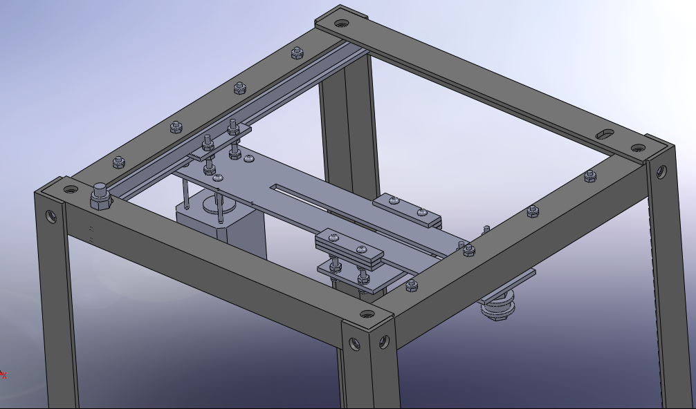 overall shot of the whats been modeled so far (as you can see, not too much). The aluminum angle frame (which has already been constructed) is the box frame structure to which everything bolts to. Following both bothacker and makerbot layouts, the bottom empty space is reserved for all the microcontrollers, relay boards, power supply, etc. The second level (the grey slab 1/3 up the image) is a 1/2" sheet of lexan plastic, and its where the motors and idler pulleys for the z axis will be located. You can see the x stage motor at the top right of the image.